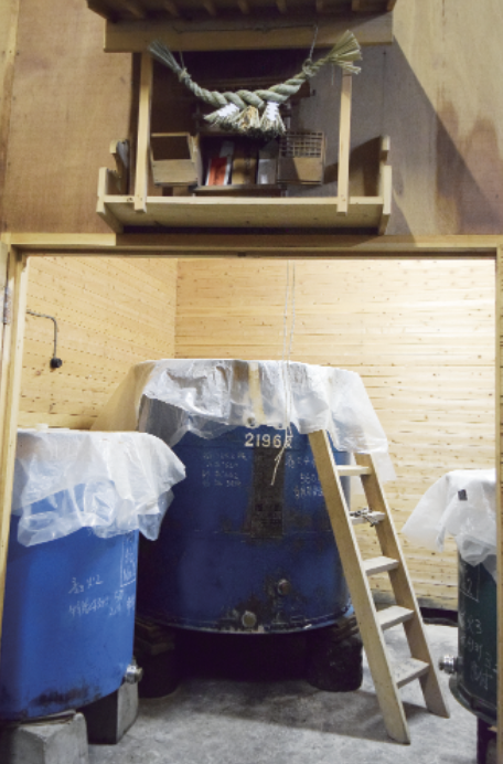 限られたスペースを丁寧に振り分け、酒造りに活かしている蔵の中。槽の上にも、天井から吊るように収納された麹箱があり、大吟醸専用に設けた部屋を守るように神棚が。