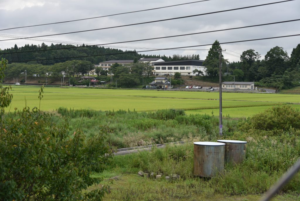 有賀醸造の裏手には田んぼが広がっています。その向こうには小学校。日々の酒造りの合間に、裕二郎さんはよくこの風景を眺めています。