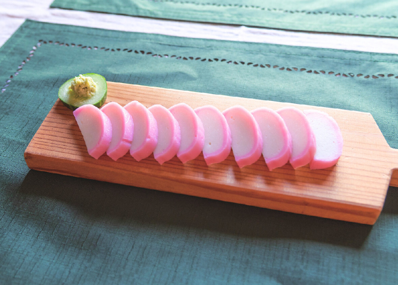 蒲鉾はそのままではやや淡白な味わいですが、これを薄造りのようにスライスしてワサビ醤油で食べると、淡い香りと旨味が引き出され、とても美味しくなります。
