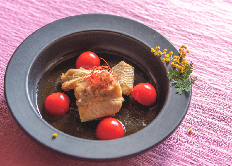 いわきの海から揚がる「常磐もの」カナガシラ。淡泊で繊細な白身をたっぷりのオリーブオイルとにんにくで仕立てたアヒージョは、皿が手元に届いた瞬間から香りが高く立つ。熱した油が小さく泡立ち、ニンニクの芳香が鼻をくすぐる。